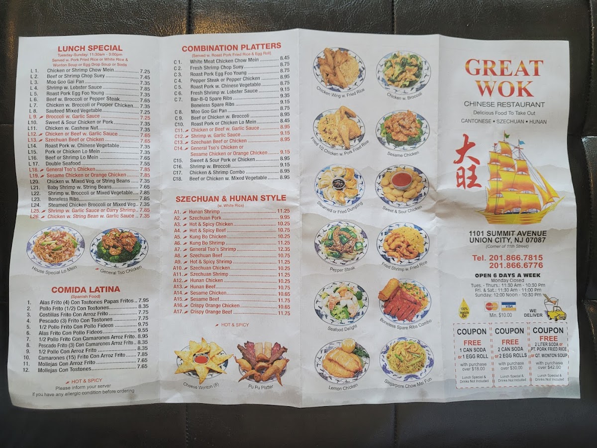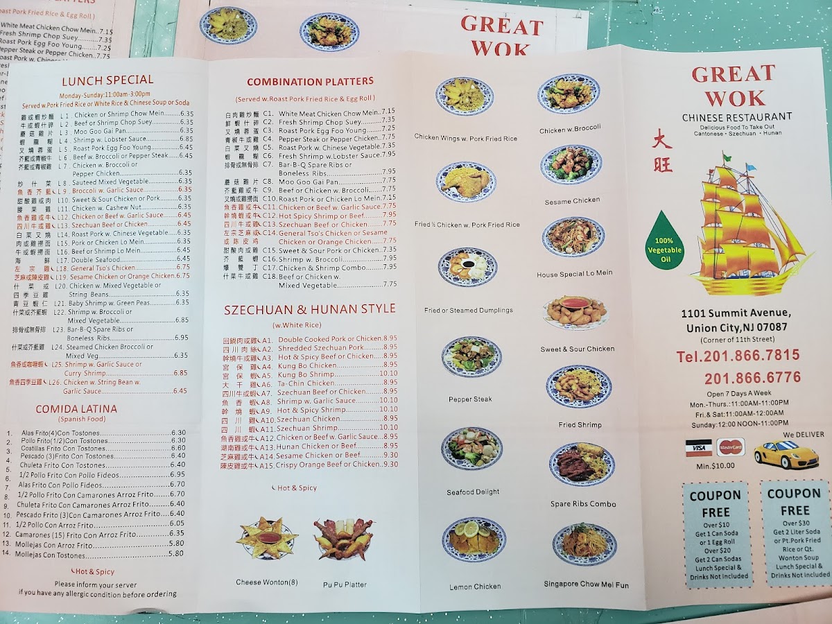 Great Wok offers a menu that blends classic Chinese dishes with a touch of local flavor, perfect for everyday meals or casual gatherings. The menu features a range of comforting and familiar options, from tender Chicken with Broccoli and savory Beef with Pepper Steak to flavorful Szechuan and Hunan specialties that bring a bit of spice to the table.